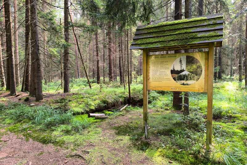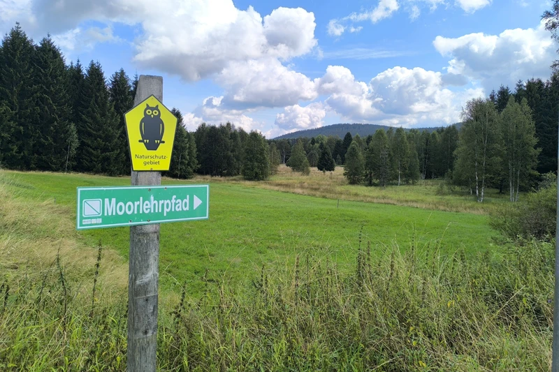 Der ca. 4,4 km lange Moor- und Wiesenlehrpfad führt durch zwei besonders wertvolle Naturschutzgebiete. In den „Muldenwiesen“ erlebt man die verschiedenen Wiesentypen, von Nasswiesen mit kleinen Tümpeln bis zu Berg-Mähwiesen mit ihrer bunten Blütenpracht. Im Naturschutzgebiet „Am alten Floßgraben“ steht der Lebensraum Moor im Mittelpunkt. Hier ist ein renaturiertes Übergangsmoor, umgeben von sich selbst überlassenem Fichten-Moorwald, zu bestaunen.